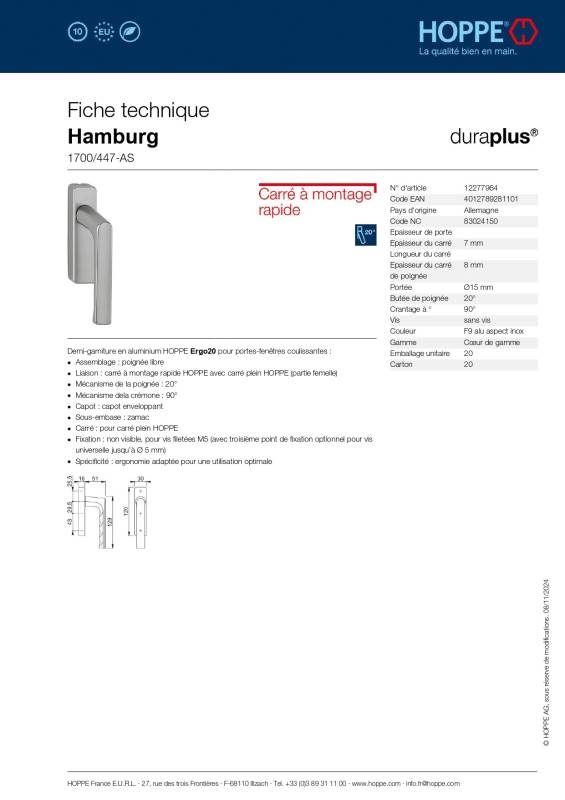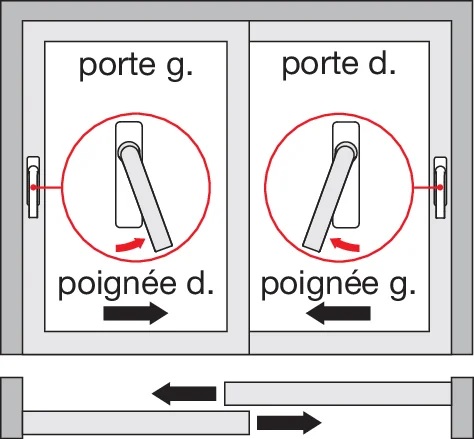 La position à 20° de la poignée au lieu de 90° permet une ouverture plus large du coulissant.